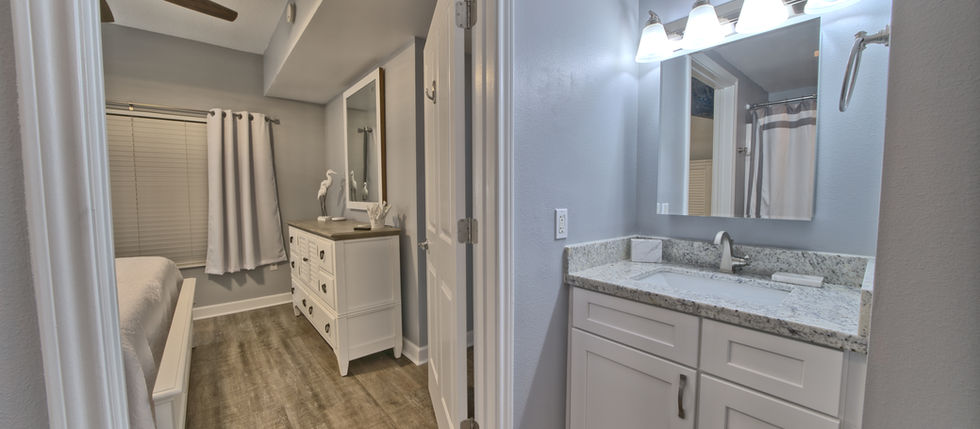 Our condo is a completely updated 1 Bedroom, plus bunkroom & 2 Bath condo at Shores of Panama. There is a king bed in the master bedroom with a private bathroom, a trundle day bed with a private bathroom and a queen sleeper sofa in the living room. Fully stocked kitchen for all your cooking needs. Super Capacity Washer/Dryer. This adorable condo is beautifully decorated. Enjoy the view of the lagoon style pool and the beautiful Gulf of Mexico from the comfort of your own private balcony.